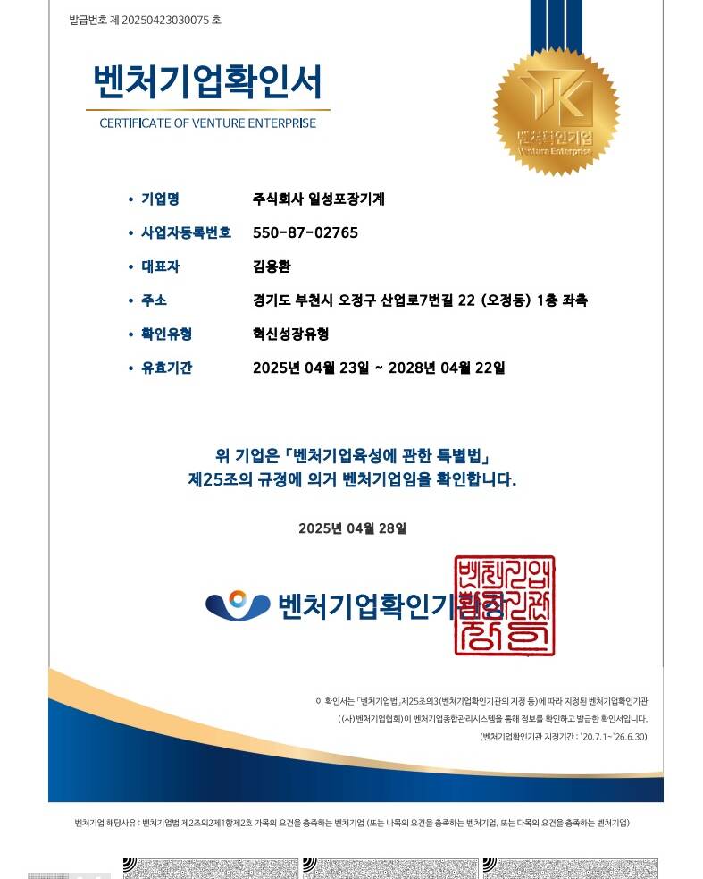 보여지는 포장보다, 품질이 증명하는 신뢰를 만듭니다. 일성포장기계는 기술의 정밀함과 운영의 효율성을 동시에 추구하며, 제품이 가진 본연의 가치를